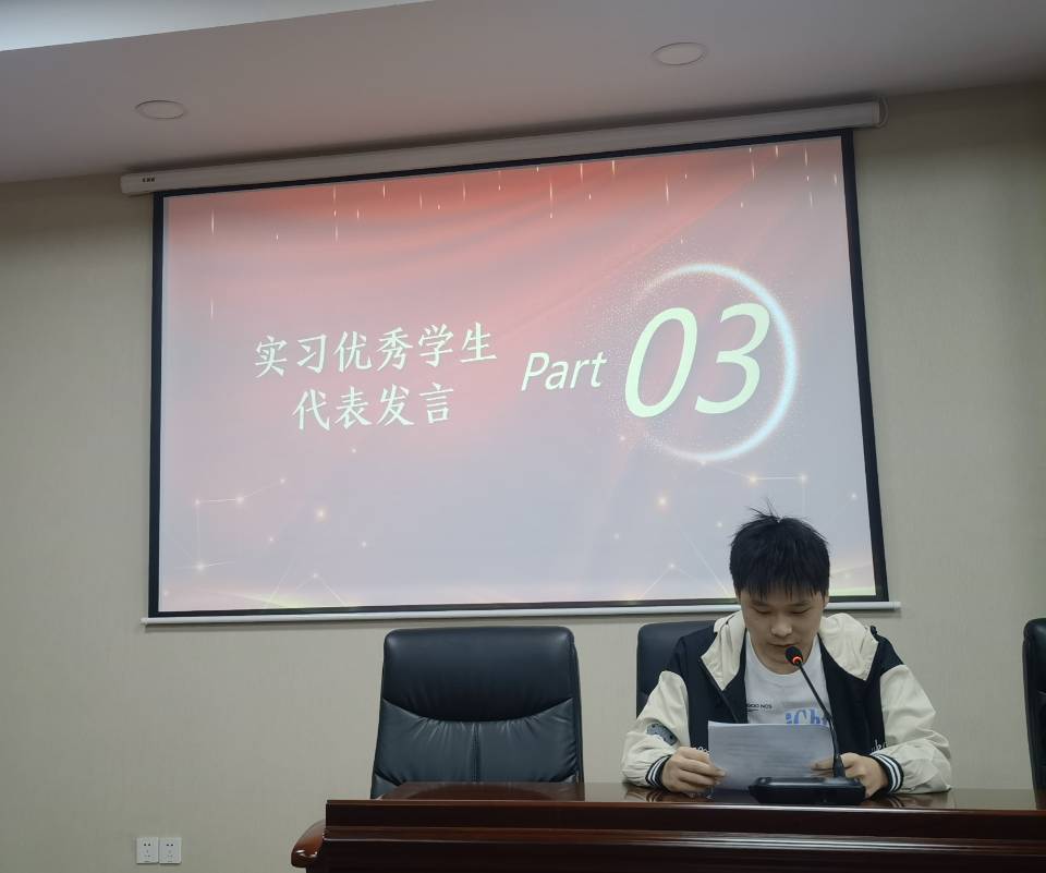 吴骏同学作为实习优秀学生代表作了发言,对工学结合期间的经历做了主要的总结,表示在实践中获得了丰富的经验并励志做一个有志向、诚实守信、学会学习、学会做事、关于创新、勇于实践的“高博青年”。