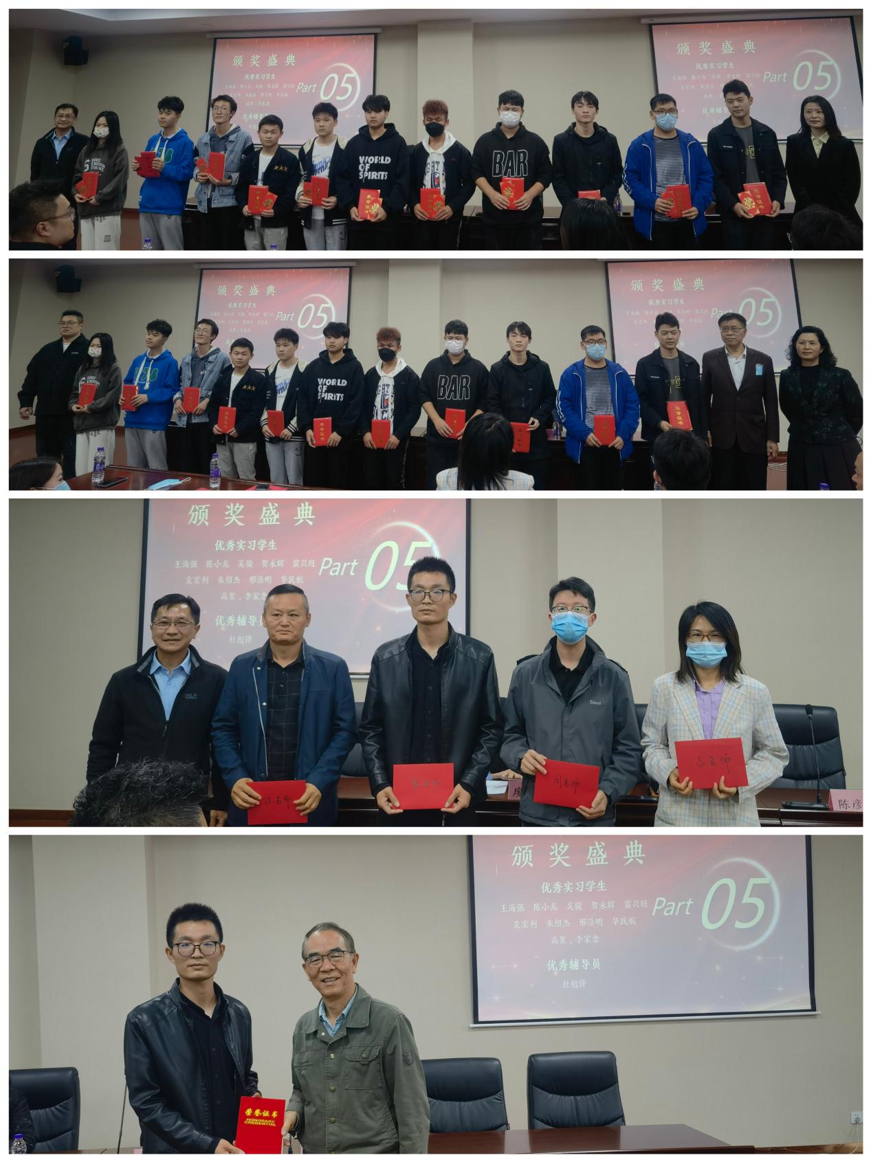 最后,学校和企业领导分别为表现突出的11位实习优秀学生和1位实习优秀辅导员杜相锋老师颁发荣誉证书和感谢信,各位领导老师对2021级工学结合受表彰的同学表示热烈祝贺并合影留念。