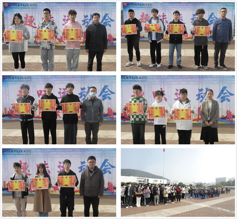 闭幕式上,总裁判长高亮主任宣布各项目比赛结果。各参会领导分别为团体项目比赛前三名的队伍代表颁发奖状,徐子良副校长为获得趣味运动会团体总分前三名的二级学院颁发奖旗。