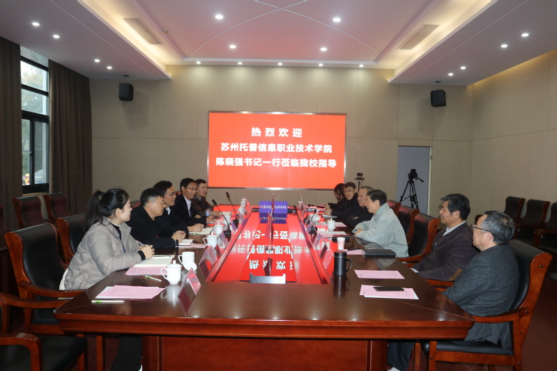 2022年11月17日苏州托普信息职业技术学院陈晓强书记一行莅临我校参观交流,学校校长朱秀林,党委书记薛辉,副书记、副校长倪筱琴、徐子良,副校长陈家颐、张建初以及相关职能部门负责人参加了座谈会。