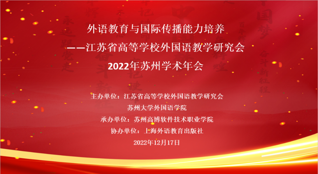 12月17日,由江苏省高等学校外国语教学研究会和苏州大学外国语学院主办、我校承办、上海外语教育出版社协办的“外语教育与国际传播能力培养”专题研讨会暨江苏省高等学校外国语教学研究会2022年苏州学术年会在苏州隆重举行。苏州大学外国语学院院长朱新福教授、苏州大学外国语学院副院长孟祥春教授、苏州大学东吴学院大学外语系主任张卓副教授、苏州市职业大学外国语学院副院长李英副教授、上海外语教育出版社基础教育部总经理黄新炎博士、我校校长助理兼人文社会科学学院院长黄兴教授、我校特聘教授洪庆福等多位专家出席本次年会线下会议,数十位苏州和省内兄弟城市的高校外语教育工作者线上参会。