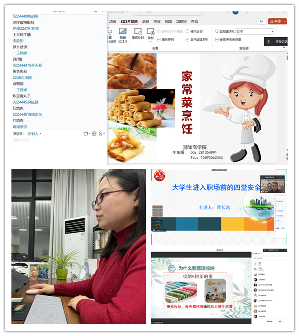 本学期高博特色课面向2022级全体学生,编排了16个教学班,开设了“家常菜烹饪”“安全管理常识”“家庭日常医护”等8个单元课程,安排了20名专兼职老师授课。每周一、周四晚上6点半至8点,学生们通过超星网络教学平台和腾讯会议,线上观看直播授课。