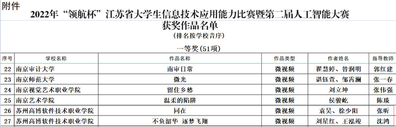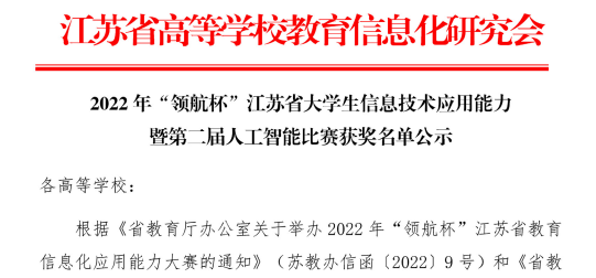 近日,2022年“领航杯”江苏省大学生信息技术应用能力暨第二届人工智能比赛获奖名单公示,全省123所本、专科院校申报748项参赛作品,经专家分组评议,共评选出获奖作品319项,其中一等奖51项。我校推荐的作品与“985”、“211”院校同场竞技,最终突出重围,获得两个一等奖,同时也刷新了学校参加本项赛事以来的最好成绩。