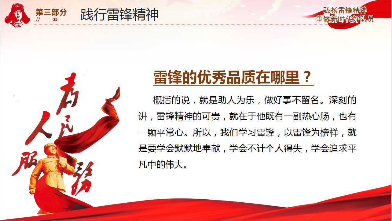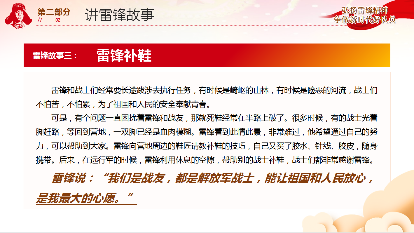 活动中,同学们集中学习了习近平总书记关于弘扬雷锋精神的重要论述,并对雷锋同志的事迹进行了回顾。通过讲雷锋故事——《雷锋帮大嫂买火车票》、《雷锋补鞋》、《雷锋背残疾人过河》、《雷锋帮助失学儿童》,同学们回顾了雷锋从一名普通战士成长为全军全国人民共同学习的榜样的历程,重温了那个时代的人物责任感,加深了对于雷锋精神的理解和感悟。