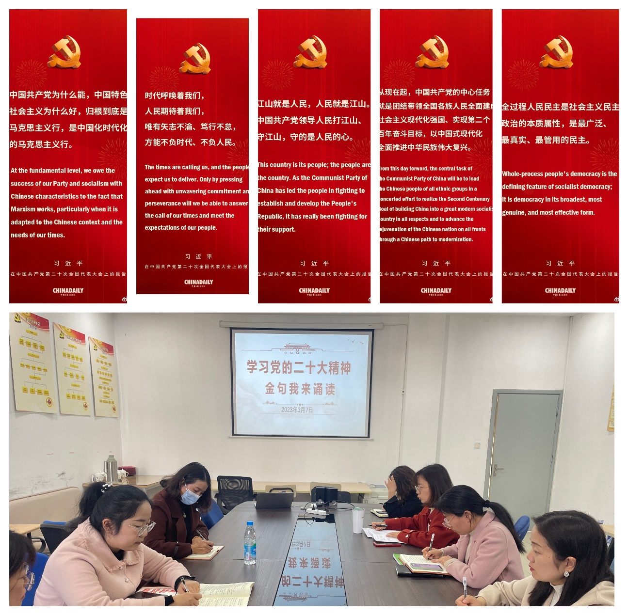 人文学院党总支副书记崔红梅、人文学院副院长兼外语系主任马亚丽,外语系党支部书记卢春林、应用英语专业教研室主任张凤、青年教师代表高梦佳、徐达等诵读了二十大经典金句,内容包括了教育科技人才强国、科技创新、社会主义文化强国、青年工作、党的建设等,党员们结合教学工作实际,就诵读内容交流了学习心得。