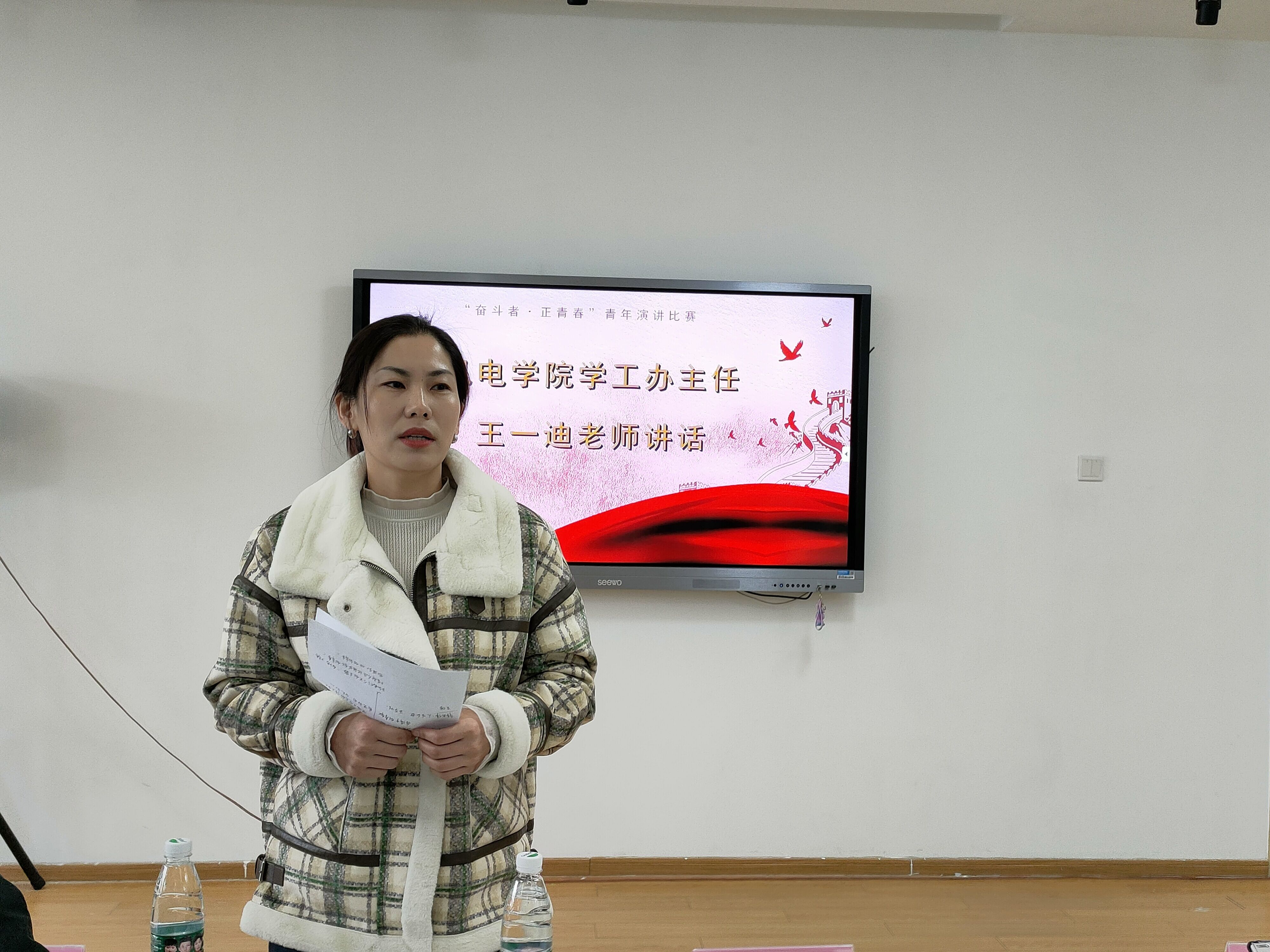 选手演讲结束后,机电工程学院学工办主任王一迪老师进行总结点评,她充分肯定了选手们的表现,每位选手都将自己对“奋斗者·正青春”这一主题的感悟表达得淋漓尽致。同时,她也希望每一位同学都能在大学书写出属于自己的青春奋斗篇章。