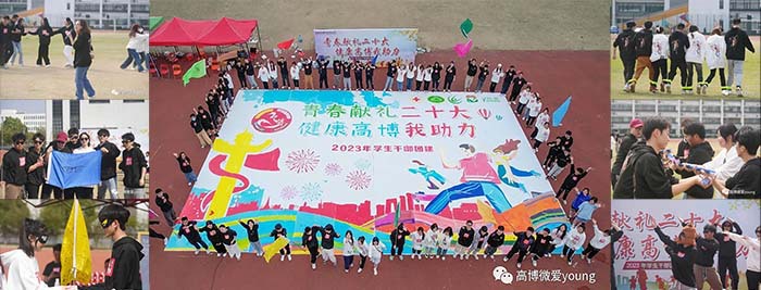 团建活动由热身环节、组队环节、驿站传书、十人九足、珠行万里、才艺展示。在热烈的比赛之后,开展了纳斯卡巨画环节,要求是每组成员要完成各自画布的绘制,最终十组成员的画布拼接成为一幅10*15米的巨画。大家分工明确,互帮互助,充分体现了合作与竞争的关系。当巨画拼接完成后,展现出“青春献礼二十大 健康高博我助力”的主题,成为团建的高潮环节。