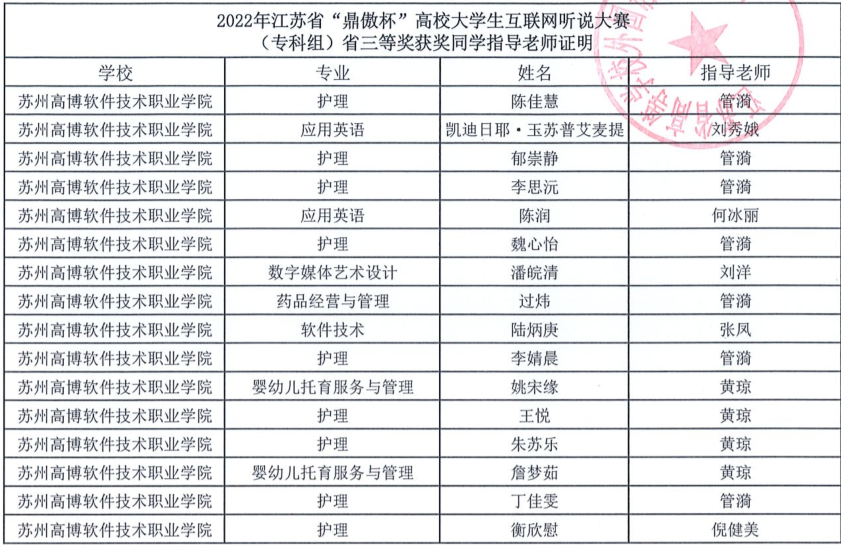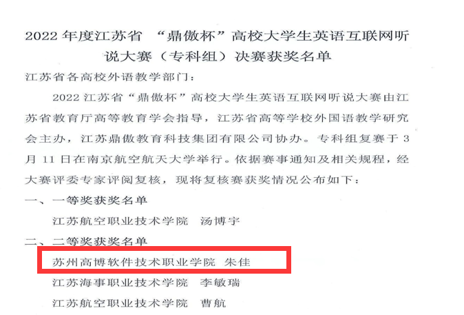 由江苏省高等学校外国语教学研究会主办,江苏科信智能教育研究院、江苏鼎傲教育科技集团有限公司协办,南京航空航天大学承办的2022年江苏省“鼎傲杯”高校大学生英语互联网听说大赛决赛于3月11日在南京落下帷幕。经过紧张而激烈的角逐,我校学生斩获二等奖1名、三等奖17名,另有7名教师获得优秀指导教师奖。