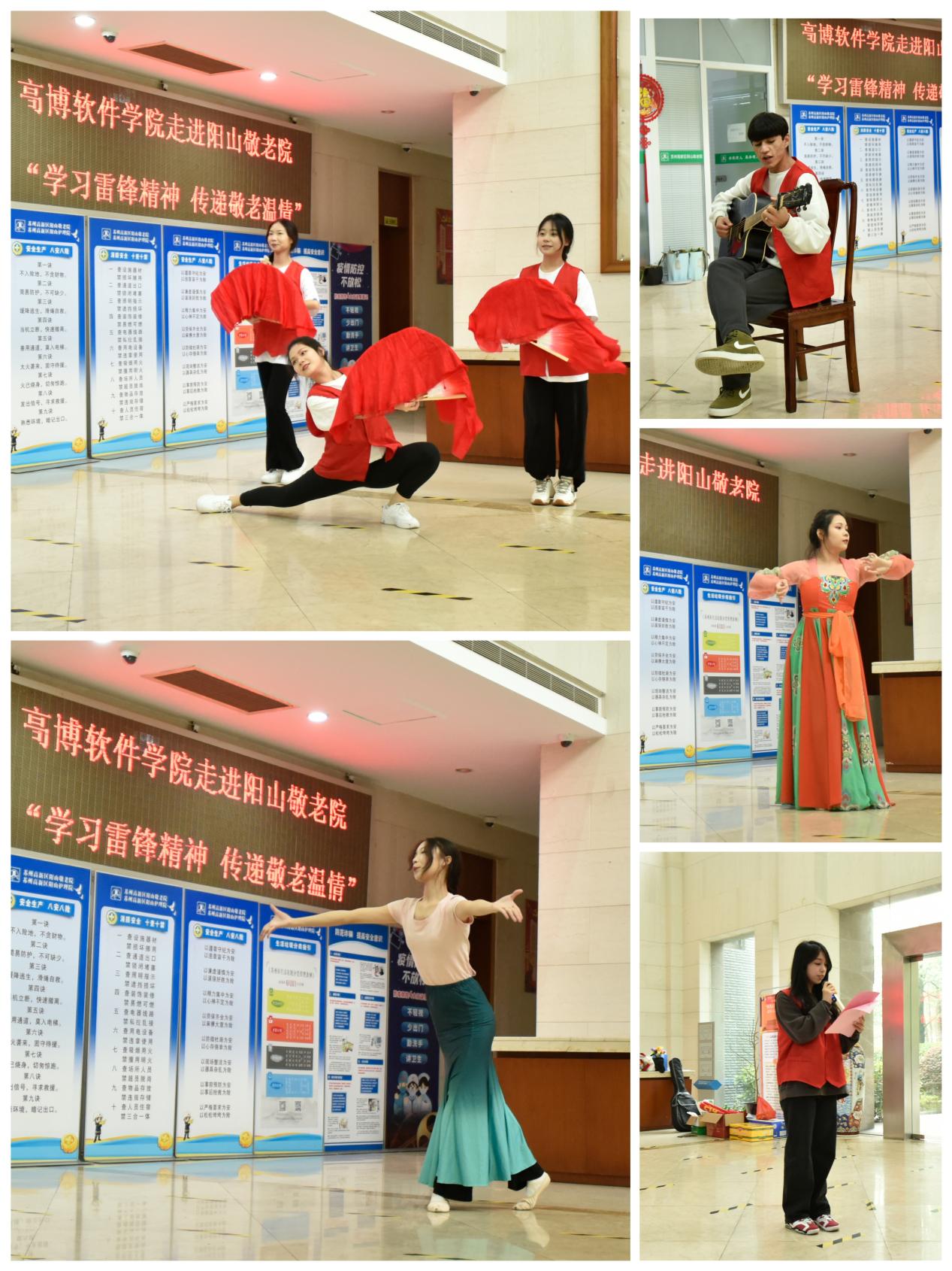 高博学子走进敬老院,开展慰问演出活动。活动中,志愿者们表演了《古典舞》、《民族舞》、《吉他弹唱》等丰富多彩的文艺节目,给老人们带去了欢乐和温暖,为敬老院增添了一份春日的温馨。