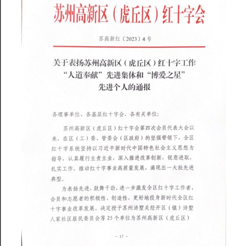 根据苏州高新区(虎丘区)红十字会发布《关于表扬2022年度红十字会“人道奉献”先进集体和“博爱之星”先进个人的通报》(苏高新红【2023】3号)文件,我校红十字会被评为“人道奉献”先进集体称号,王琴老师被评为“博爱之星”先进个人。