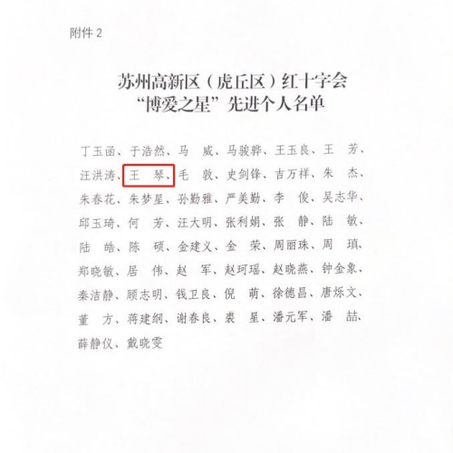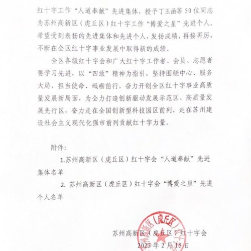 根据苏州高新区(虎丘区)红十字会发布《关于表扬2022年度红十字会“人道奉献”先进集体和“博爱之星”先进个人的通报》(苏高新红【2023】3号)文件,我校红十字会被评为“人道奉献”先进集体称号,王琴老师被评为“博爱之星”先进个人。