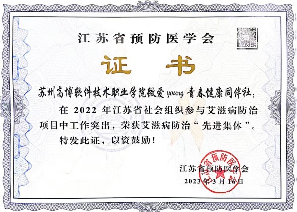 3月26日,在江苏省疾病预防控制中心主办的2023年度社会组织参与艾滋病防治项目能力建设培训会上,我校微爱young青春健康同伴社被评为江苏省艾滋病防治“先进集体”荣誉称号。