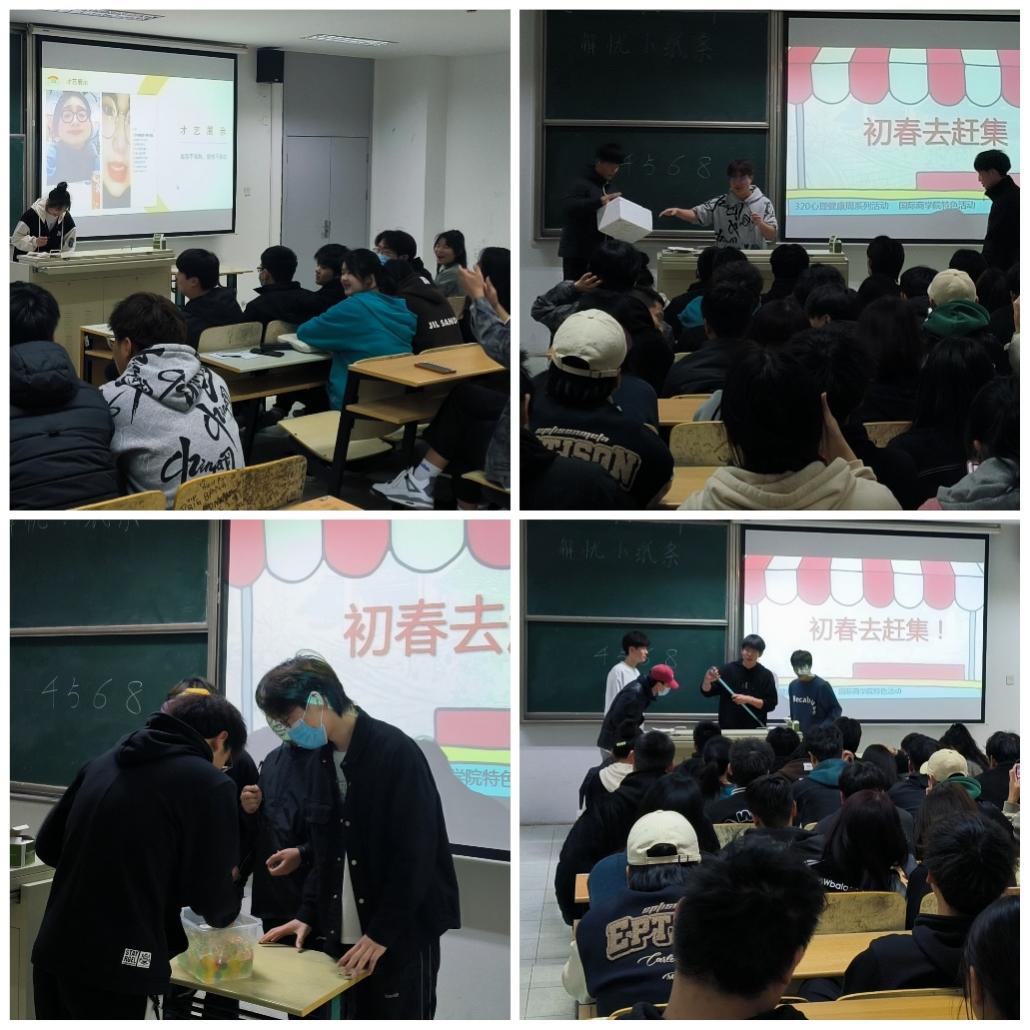 为进一步提高学生心理健康水平、加强心理健康教育引导、构建和谐校园。根据学校《关于开展“3.20咱爱您”心理健康教育周活动的通知》要求,国际商学院结合学院特点、突出专业优势、创新活动内容和载体,于3月29日晚在12-306阶梯教室举办了主题为“初春去赶集”的学院特色活动。