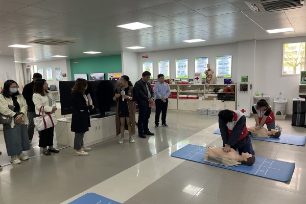 高新区红十字会常务副会长、高新区红十字会戴晓雯、苏州高博软件技术职业学院学生处副处长兼学生健康中心主任王琴、各二级学院辅导员代表一行首先来到了苏州市大学生应急救护培训基地、苏州市大学生安全应急体验馆。苏州职业大学团委老师刘诗琪对基地的设备设施、急救培训课程、应急逃生课程等方面进行了介绍。