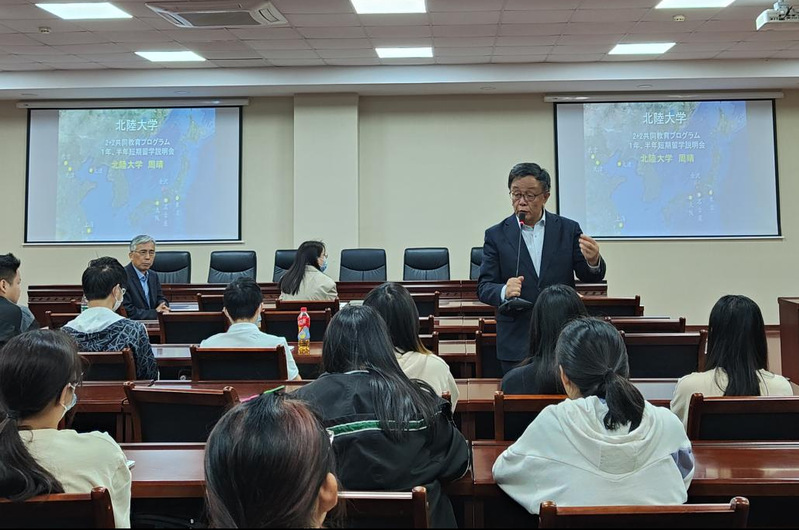 会谈结束后,周晴等还来到人文学院,为人文学院日语专业学生举行了留学宣讲会。周晴院长和付超一科长分别介绍了北陆大学的地理位置、发展历史、院系及专业设置、教学和生活设施以及学生活动等基本情况,并重点就我校学生以2.5+1+2形式到北陆大学专升本项目的申请流程、入学条件、专业选择以及留学日本期间的学习和生活安排等做了详细说明。并回答了学生的提问。
