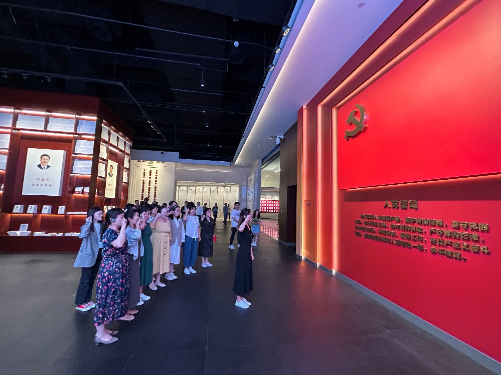 参观最后环节,医学院教工党支部书记张婷和医学院党总支副书记赵洪鹏分别带领教工支部党员和学生支部党员进行宣誓,誓词虽短,字字千钧,初心使命,守誓如山。