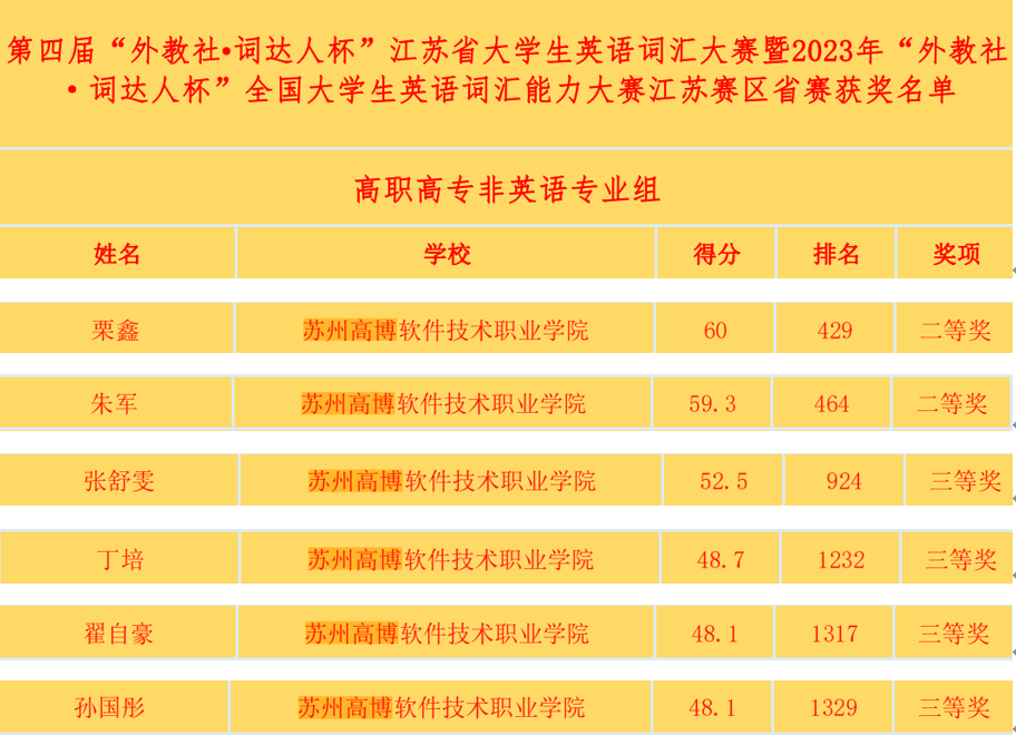 由中国外语战略研究中心、中国外语教材与教法研究中心和上海外语教育出版社联合主办的第四届“外教社·词达人杯”江苏省大学生英语词汇大赛暨2023年“外教社·词达人杯”全国大学生英语词汇能力大赛江苏赛区比赛于5月13日顺利举行。我校栗鑫、朱军2名学生获得高职高专非英语专业组二等奖,张舒雯、丁培、翟自豪、孙国彤等4名学生获得高职高专非英语专业组三等奖。
