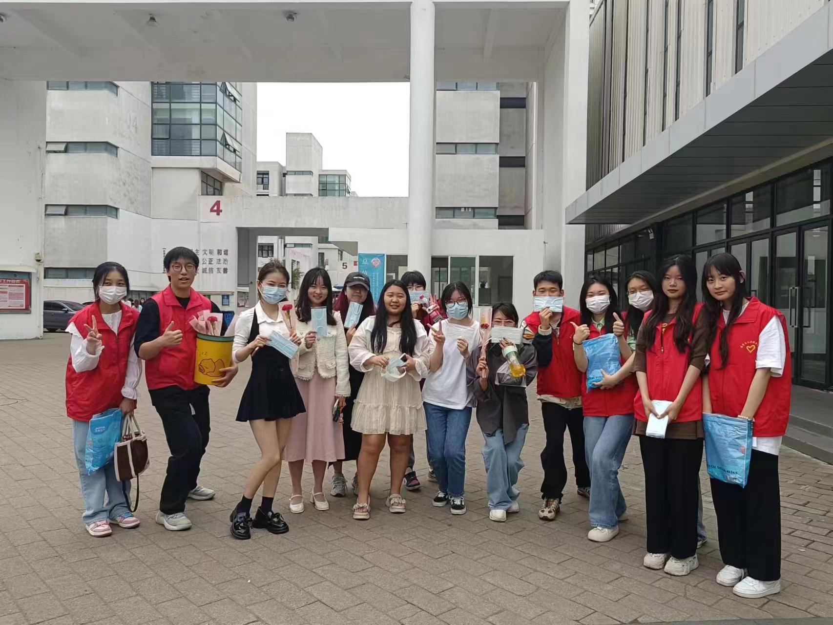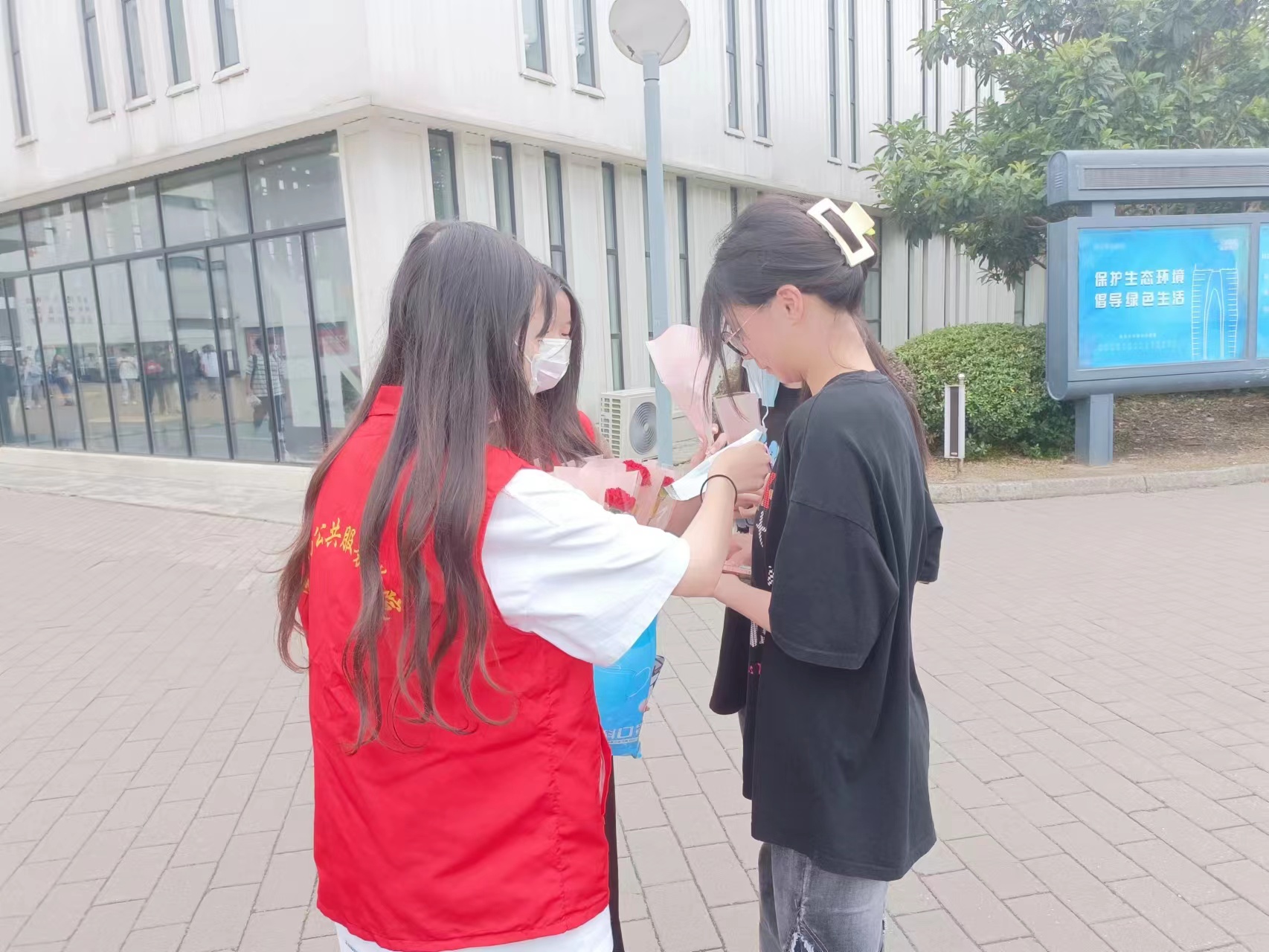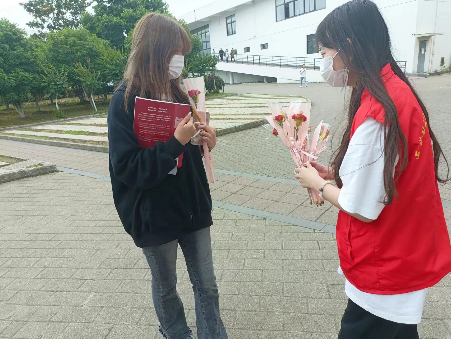 活动中,我院的志愿者们身穿统一的志愿者服,手持鲜花和口罩,在学校二食堂门口分发鲜花的同时不忘提醒他们做好防护。同学们收到鲜花后,都非常开心,纷纷向志愿者表示感谢。有的同学更是和志愿者合影留念,留下了美好的回忆。