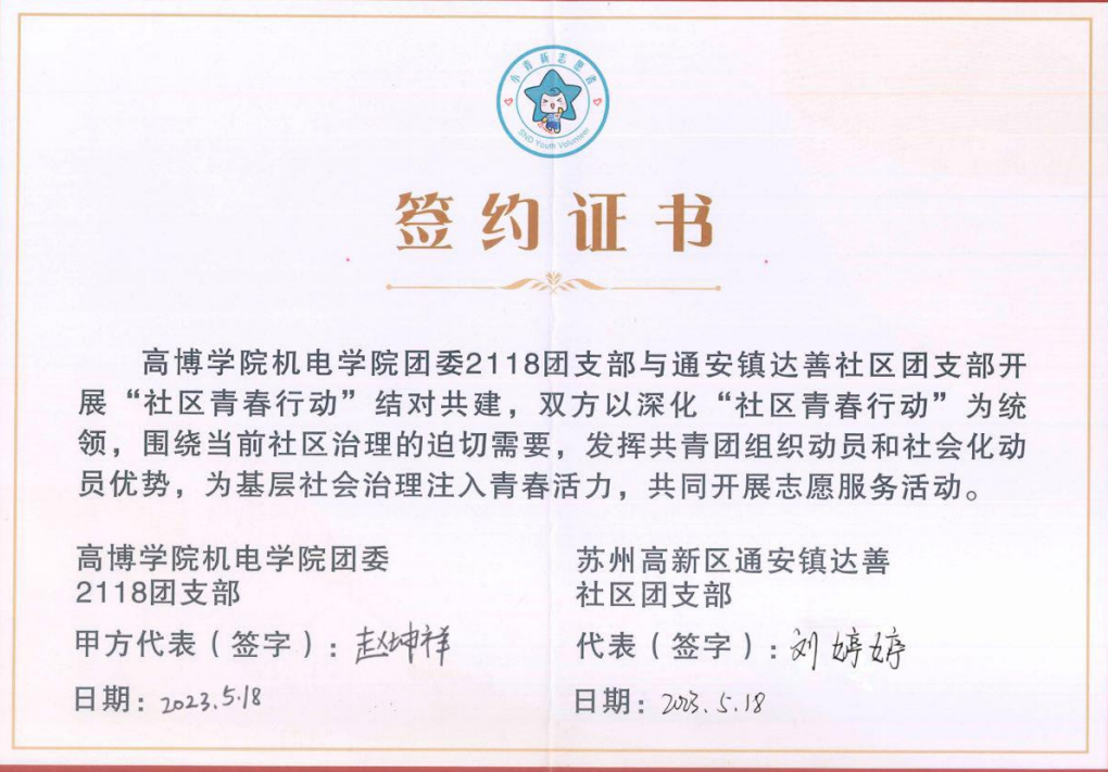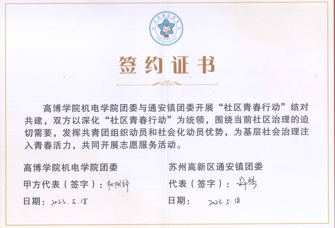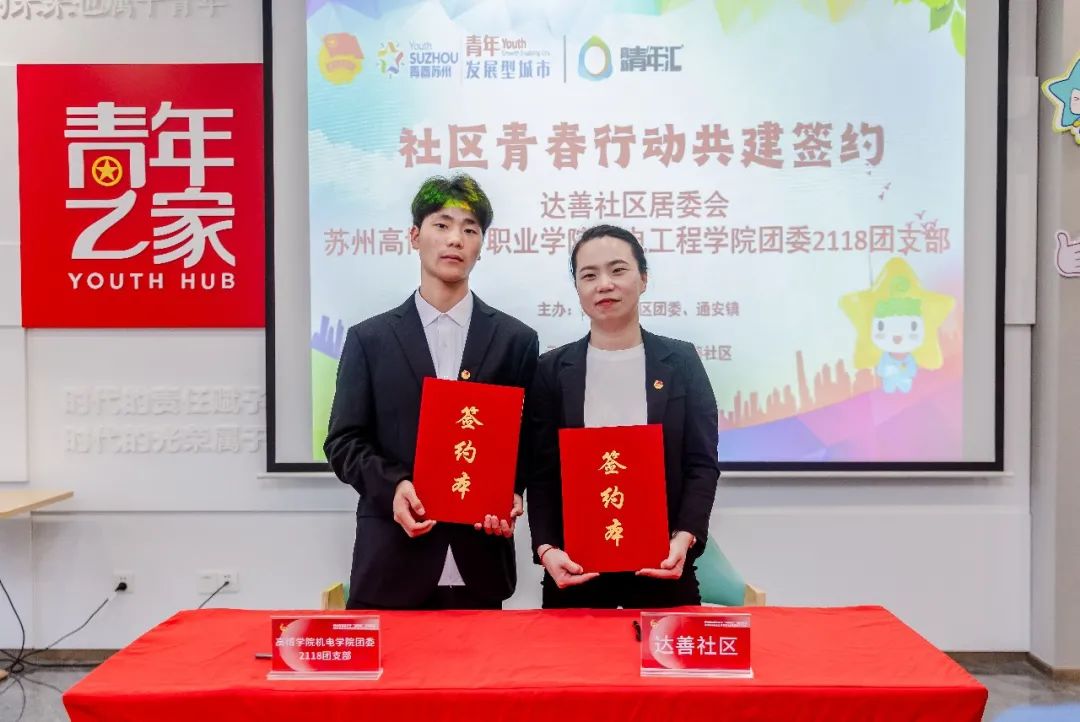 为进一步加强团员队伍建设,深入学习贯彻党的二十大精神,提升学生青年综合素质,鼓励学生青年把真识学干落于实处,机电工程学院分团委在校团委的带领下“走出去,引进来”。5月18日,由苏州高新区团委、苏州高博软件技术职业学院团委、通安镇共同主办的社区青春行动共建签约仪式在达善社区青年之家举行。
