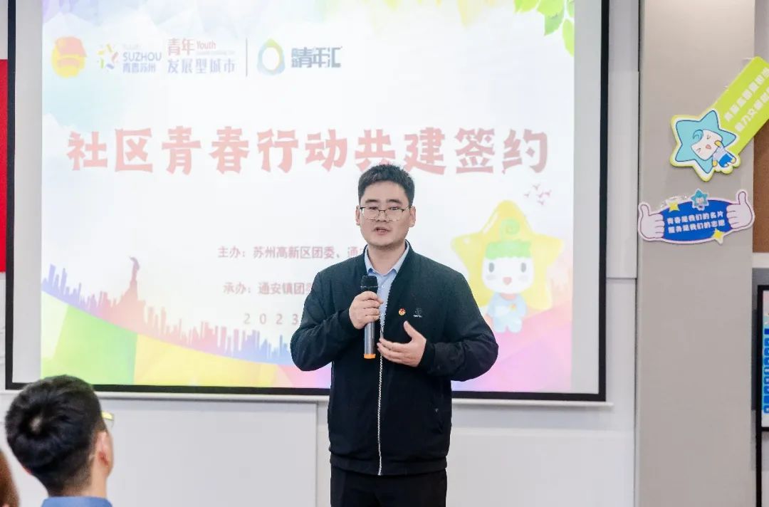苏州高新区团委副书记陈峰在活动上致辞。他希望通过本次共建签约,通安镇团委和学校机电工程学院分团委能充分整合阵地资源为青年所用,提供学习、健身、休闲、社交、志愿服务、亲子互动等各类服务活动,面面俱到,样样俱全。