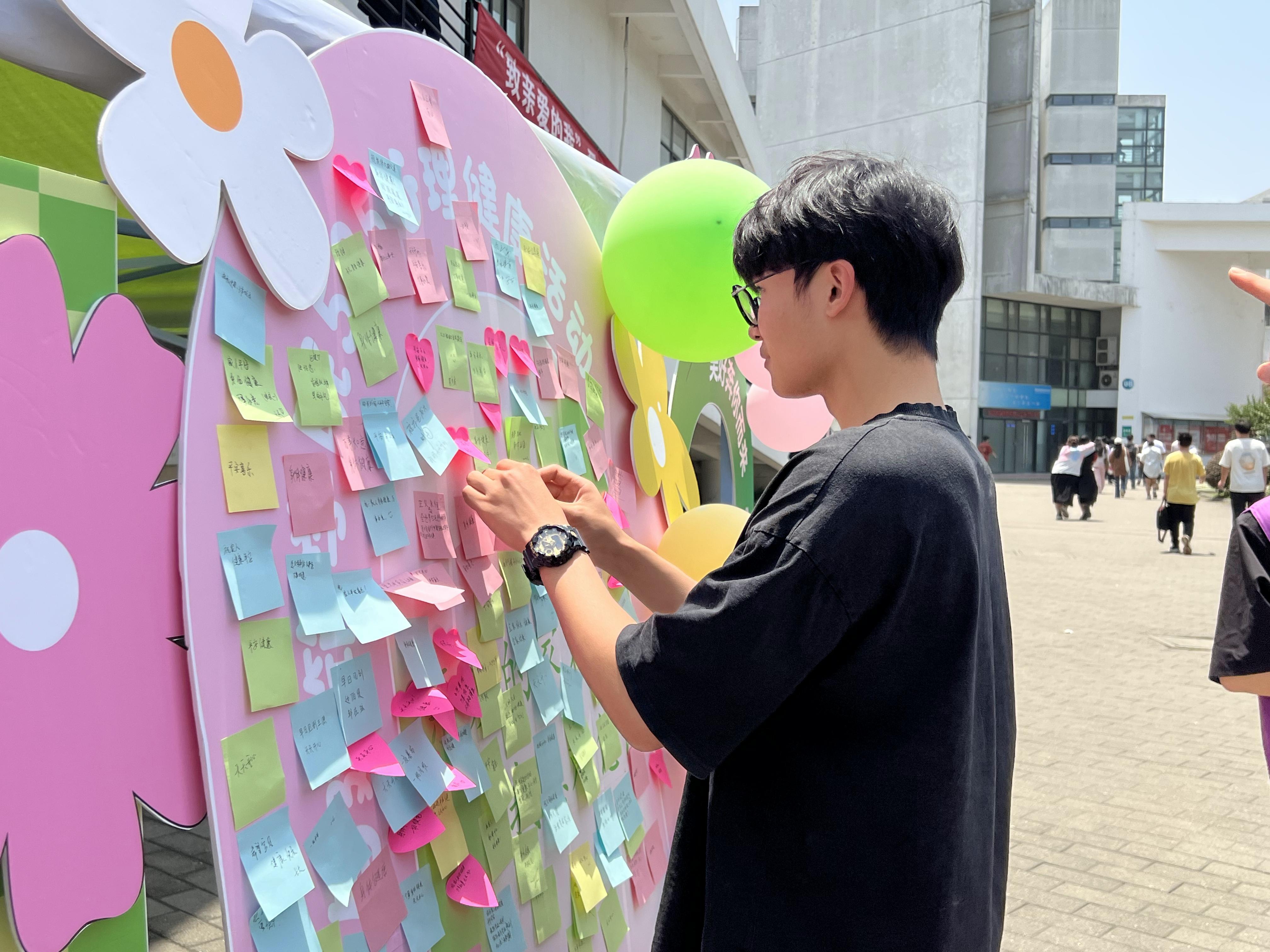 同学们在便签纸上留下对家人的祝福,并把写好的便签张贴在活动背景墙上,参与活动后领取礼品。活动引起同学们的极大反响,纷纷拿起手中的笔,在便利贴上写下对家人的祝福。同学们心存感恩,留下了祝愿家人平安喜乐、一帆风顺、健康顺遂等祝福语。现场氛围活跃热闹。