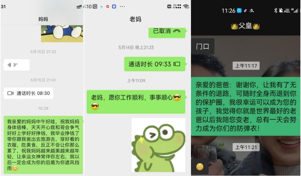 同学们在微信上发送给家人一段祝福语。祝福语可以是一段文字也可以是一段语音,发送完成后可现场领取礼品。同学们纷纷给家人发送祝福,感恩父母对自己的无私付出,感谢父母的陪伴,愿父母平安顺利。家长们收到祝福后也表示开心和欣慰。