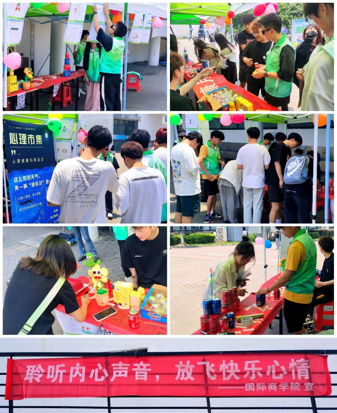 为进一步培育学生自尊自信、理性平和、乐观向上的心理品质,增进学生对心理健康知识的了解,营造良好的心理健康教育氛围,根据学校《关于开展“5.25我爱我”心理健康教育月活动的通知》要求,国际商学院于5月29日上午10:30-12:30举办了“心理市集”心理知识教育科普活动。