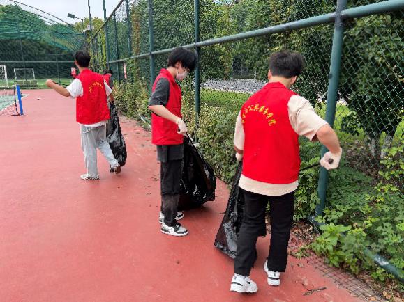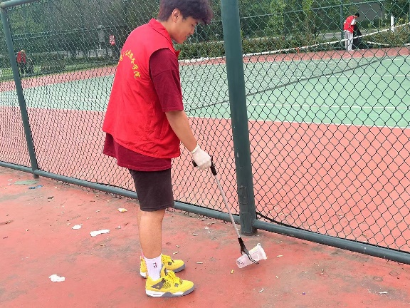 中午12点30分,志愿者们身穿红马甲,手中拿着劳动工具来到青山绿庭社区的体育活动中心,志愿者们合理分工,不放过网球场内的每一处死角,你捡垃圾我装袋,弯腰捡拾不怕脏,积极发挥着当代青年的牺牲奉献精神,使周边环境焕然一新。