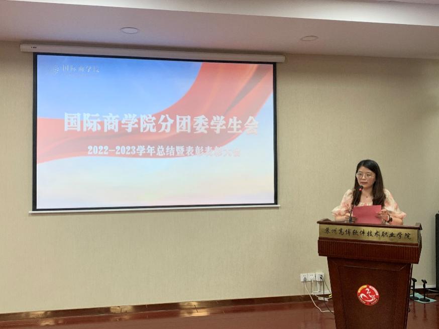 在激昂的中华人民共和国国歌声中,大会正式开始。会上,首先由姚瑶老师对国际商学院本学年学生工作做了总结,她对在本学年表现优异且获得荣誉的同学表示祝贺,对在各项活动中辛勤付出的学生们表示感谢,同时对青年学习社和学生会的同学提出了新要求,希望在接下来学生会的改革创新中大家勇毅前进,争做实干,以崭新面貌迎接新学期。