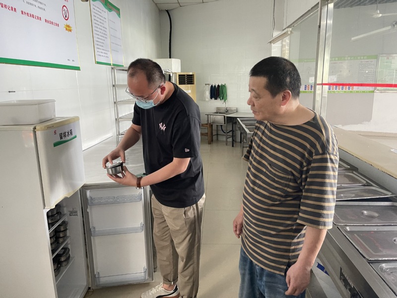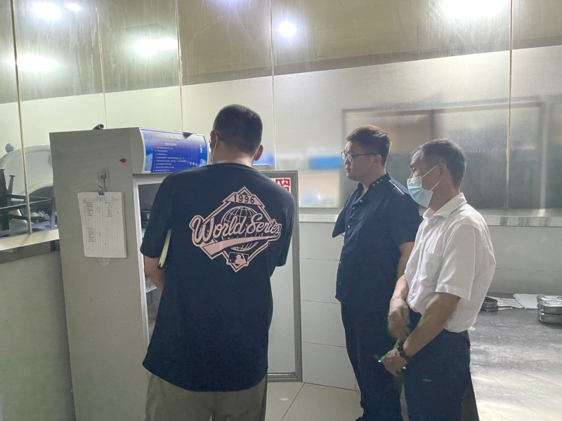 后勤管理处副处长潘新法、处长助理张宏虎仔细察看了食堂后厨操作间卫生状况、原料采购和贮存、食品加工操作流程、食品留样记录、清洗消毒等情况,详细询问食堂管理人员和工作人员了解情况,对存在的问题立即提出整改要求。