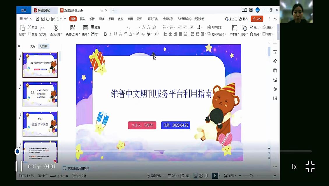 为了帮助师生更好地了解图书馆的数字资源,提高维普中文期刊数据库利用率,4月20日晚图书馆马梦丹老师在腾讯会议为大家带来了一场“维普中文期刊服务平台利用指南”的主题讲座。讲座过程中,马梦丹老师介绍了维普中文期刊服务平台简介、资源概况、利用指南等,还结合实例展示了原文传递等使用技巧。此次讲座对提高读者信息素养、提升论文写作能力起到了积极推动作用。