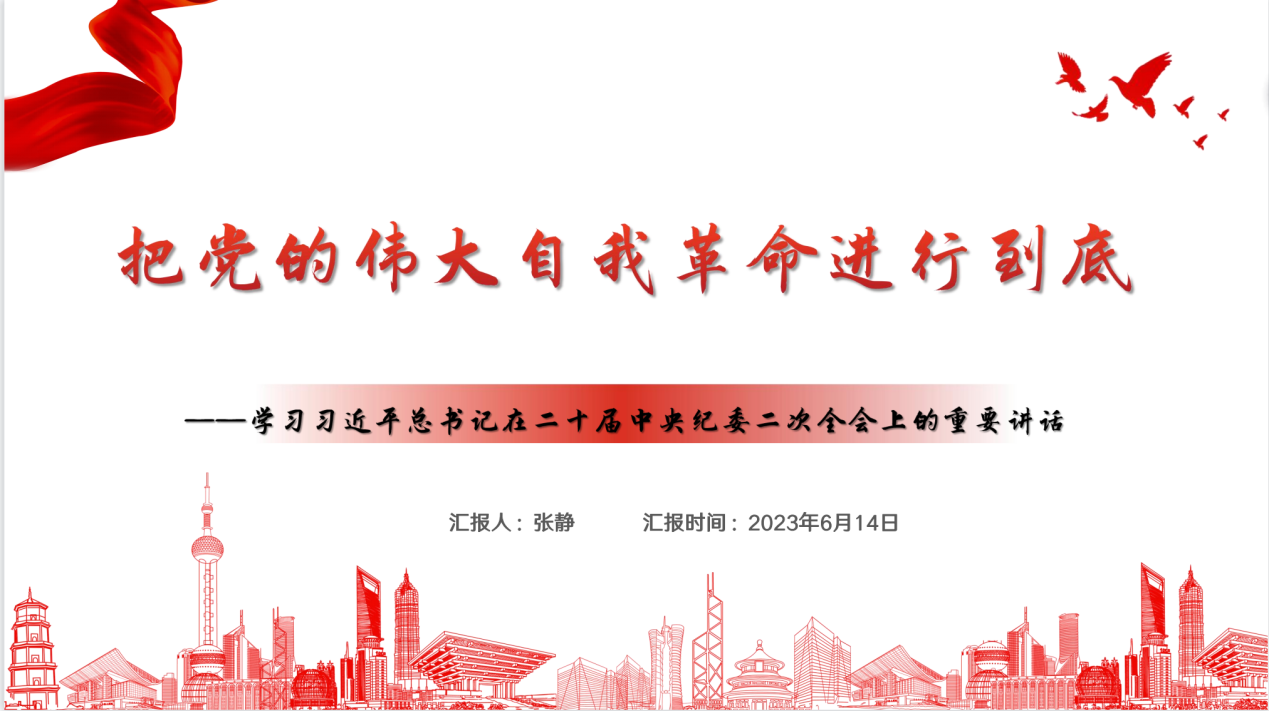 授课中,张静同志指出,党的二十大报告明确提出“完善党的自我革命制度规范体系”。面向未来,要坚持制度治党、依规治党,更加突出党的各方面建设有机衔接、联动集成、协同协调,更加突出体制机制的健全完善和法规制度的科学有效,更加突出运用治理的理念、系统的观念、辩证的思维管党治党建设党。她强调,全面从严治党永远在路上,要时刻保持解决大党独有难题的清醒和坚定。中共一大党员人数为50多人,中共二大党员人数为195人,中共三大党员人数为420人,截至2021年底中国共产党党员总数为9671.2万名,党的基层组织493.6万个,中国共产党一路走来,始终把基层党组织和党员队伍建设作为党的建设的基础性工作。如何始终“不忘初心、牢记使命”,如何始终统一思想、统一意志、统一行动,如何始终具备强大的执政能力和领导水平,如何始终保持干事创业精神状态,如何始终能够及时发现和解决自身存在的问题,如何始终保持风清气正的政治生态,都是我们党必须解决的独有难题。解决这些难题,是实现新时代新征程党的使命任务必须迈过的一道坎,是全面从严治党适应新形势新要求必须啃下的硬骨头。作为高校老师,如何始终不忘教育的初心、牢记教师的使命;如何始终统一思想、统一意志、统一行动,支持和助力学院的发展;如何始终具备强大的教育管理能力和领导水平,带领老师、带领学生走出一条特色发展的道路;如何始终保持干事创业精神状态,以积极的心态,创新的精神投入教育事业;如何始终能够及时发现和解决自身存在的问题,发现和正视问题是解决问题的起点;如何始终保持风清气正的政治生态,都是我们一直要学习的课题。