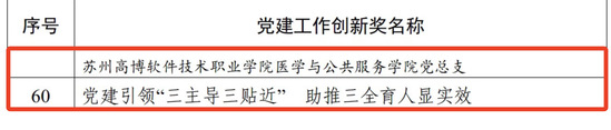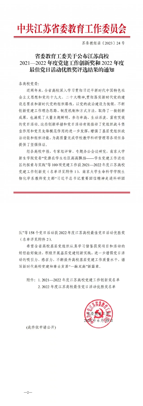 近日,江苏省教育工委公布了江苏高校2021-2022年度党建工作创新奖和2022年度最佳党日活动优胜奖评选结果。学校医学与公共服务学院党总支的《党建引领“三主导三贴近”助推三全育人显实效》荣获2021——2022年度江苏高校“党建工作创新奖”三等奖;国际商学院党总支的《党建聚力共联共建 校地协同育人育才》荣获2022年度江苏省高校“最佳党日活动”优胜奖。