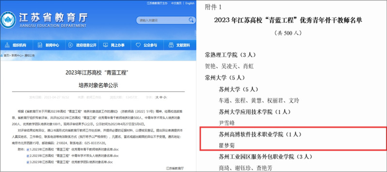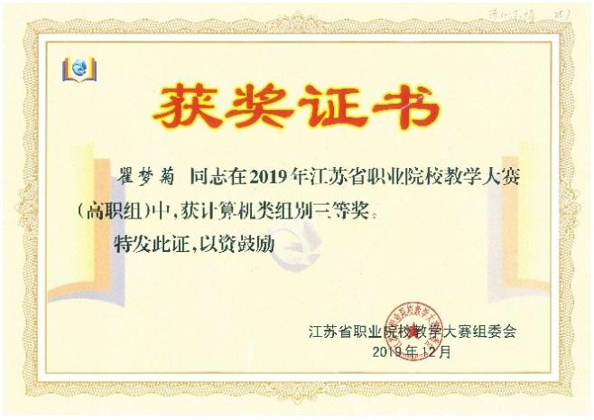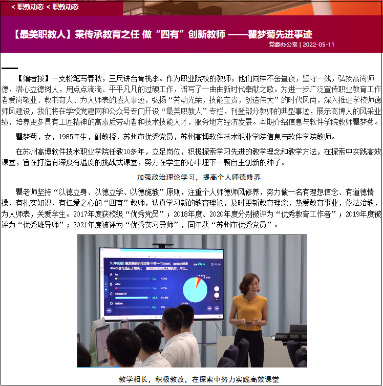 作为软件技术专业负责人,她带领团队通过教学技能大赛的不断历练,在备赛、参赛的过程中探索如何将职业院校实践教学与技能大赛进行有效地衔接,探究如何将大赛的成果合理、科学、有效地转化到日常教学中,有效解决教赛分离的问题。同时也在不断地探索如何通过教学技能大赛提升教师教学能力的途径、方法,始终贯彻“以赛促教、以赛促研,以赛促建、以赛促改”方针,提高教师的师德践行能力、专业教学能力、综合育人能力和自主发展能力,推动示范性教学,促进“能说会做”的“双师型”教师成长。主持校级教育教学成果奖一等奖,入选江苏高校“青蓝工程”优秀青年骨干教师,秉传承教育之任、做“四有”创新教师,荣获“最美职教人”称号。近年来三次评为校级优秀教育工作者,认真、严谨的工作作风,在平凡的工作岗位上取得了优异成绩,坚持党性原则,发挥了一名党员教师的先锋模范作用!