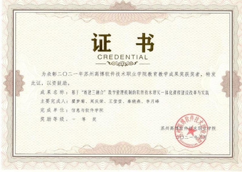 重视课堂教学,运用新理念,实践新模式,提高课堂教学效率。携手“高博-亨通”软件技术企业学院,通过“互聘互兼”校企双方共建教师团队,推行“企业导师进课堂”,共同践行“岗课赛证”一体化设计,荣获苏州市职业教育“课堂革命”典型案例三等奖。2019、2020年获江苏省教学技能大赛获得三等奖2项;2020年获长三角民办高校教师技能大赛三等奖;2023年指导学生获江苏省职业院校技能大赛“Web技术赛项”三等奖;2021年获江苏省“蓝桥杯”软件开发大赛获一等奖;2018年江苏省“蓝桥杯”软件开发大赛获三等奖;2018年江苏省现代教育技术应用作品大赛三等奖;2023年校级“课堂革命”典型案例一等奖;2021年校级教育教学成果奖一等奖;2021年校级“课堂教学设计比赛”一等奖;2018年校级“首届精彩一课”一等奖;2019年校级优秀毕业设计一等奖;2022年校级微课比赛一等奖;2020年校级教学技能大赛二等奖;2020年校级微课比赛二等奖。主持、参与省市校级14项课题的研究,校级教材建设项目1门,发表省级及以上期刊7篇,其中北大核刊1篇,参编教材2部,参与省级在线开放课程建设1门,软著、实用新型专利6项。