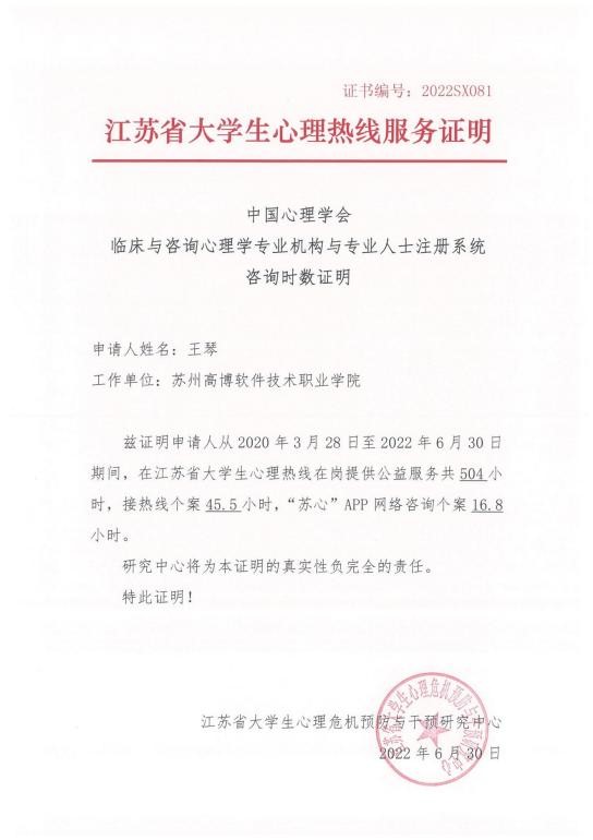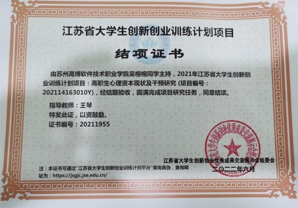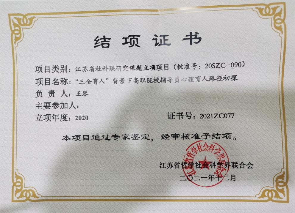 为了加强心理健康工作的系统性、规范性和专业性,她努力开展课题研究,坚持科研育人。目前江苏省社科联研究课题立项项目《“三全育人”背景下高职院校辅导员心理育人路径初探》(批准号:20SZC-090)已顺利结题。苏州高职高专院校学生工作课题——《“三教”改革背景下民办高职院校心理健康教育课课程思政路径研究》(SGZXB202028)已提交结题材料。