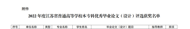 近日,江苏省教育厅公布了2022年度江苏省普通高校本专科优秀毕业论文(设计)评选结果,我校共有4项作品获奖(申报6项),获优秀毕业论文(设计)三等奖1项,团队优秀毕业论文(设计)3项(详见附件)。获奖数量及等次均位列全省民办高职院校首位。