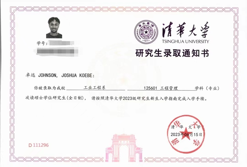 近日,我校国际交流合作处收到巴巴多斯籍留学生Johnson Joshua Koebe发来的信息,告知他于今年6月被中国清华大学录取为工业工程系工程管理专业硕士学位研究生。