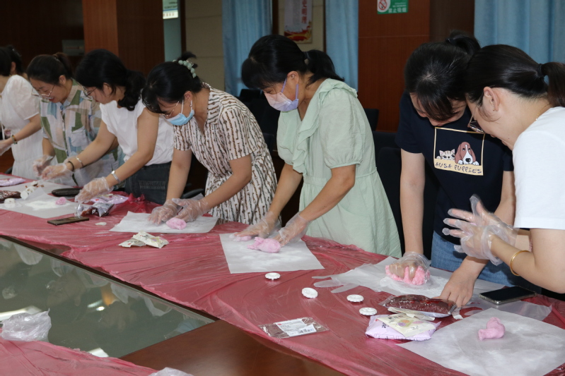 会议室里不时传来阵阵欢声笑语,老师们早早就等候在那里。指导老师简单介绍了月饼的起源和种类后,就开始示范制作,揉皮、包馅、压膜,老师们忙得不亦乐乎,不一会儿,一个个精美饱满的月饼就呈现在大家面前。