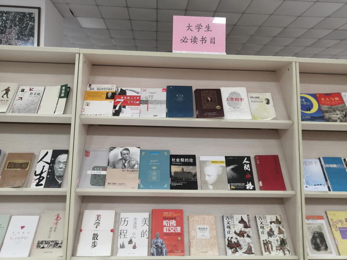 图书馆根据教育部高等教育司推荐的大学生必读书目,结合馆藏资源情况,精选了《国富论》《社会契约论》《人类简史》《我的大学宿舍生活》《瓦尔登湖》等80余册经典图书。