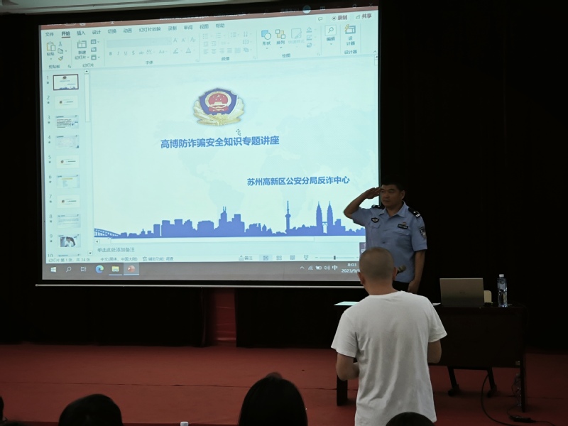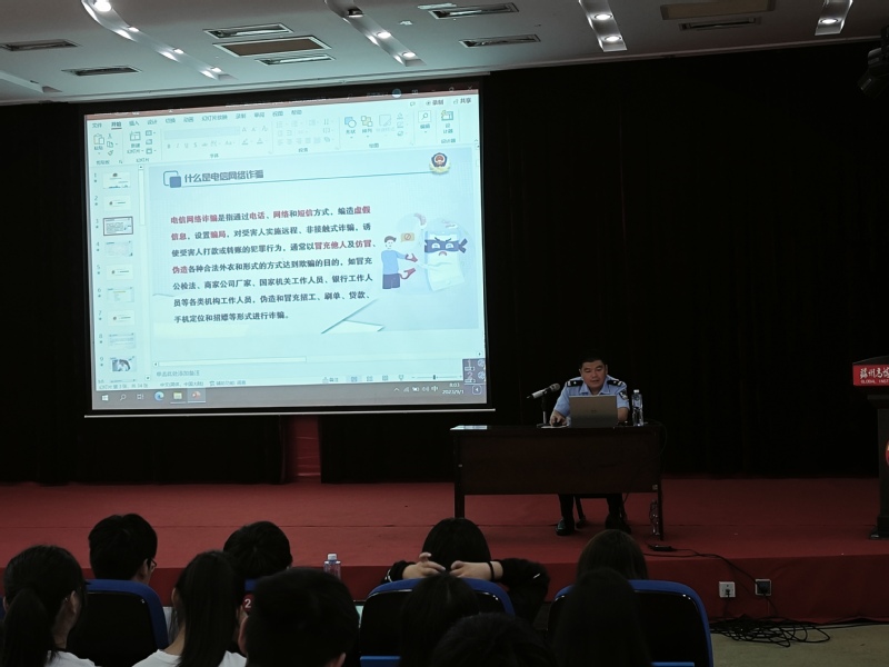 活动第二天,科技城派出所牛警官走进我校,开启预防网络和电信诈骗宣讲活动。牛警官结合近期发生的典型诈骗案例,揭露诈骗伎俩,以案释法,讲解反诈知识。牛警官通过列举冒充熟人诈骗、刷单诈骗、网购诈骗等几种常见的骗术,生动形象地介绍了电信网络诈骗的手段、特点、产生的危害,分享了真实的案利,积极与同学们进行互动,帮助同学们解决疑难困惑。宣讲最后,他还劝告同学们,买卡卖卡、买卖社交账号等行为会造成严重的法律后果,不要为了蝇头小利而成为了网络诈骗的帮凶,更不要直接参与诈骗犯罪,触碰法律的底线。
