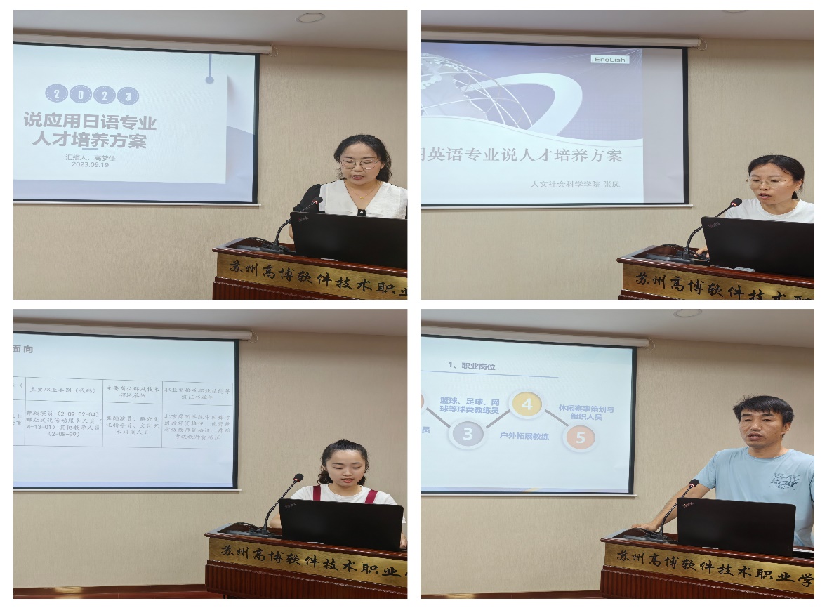休闲体育专业负责人张赞、舞蹈表演专业教师李心怡、应用英语专业负责人张凤、应用日语专业负责人高梦佳分别围绕专业职业面向、培养目标、人才培养模式、课程体系、核心课程的教学实施、师资队伍、实践条件等方面内容作了汇报。