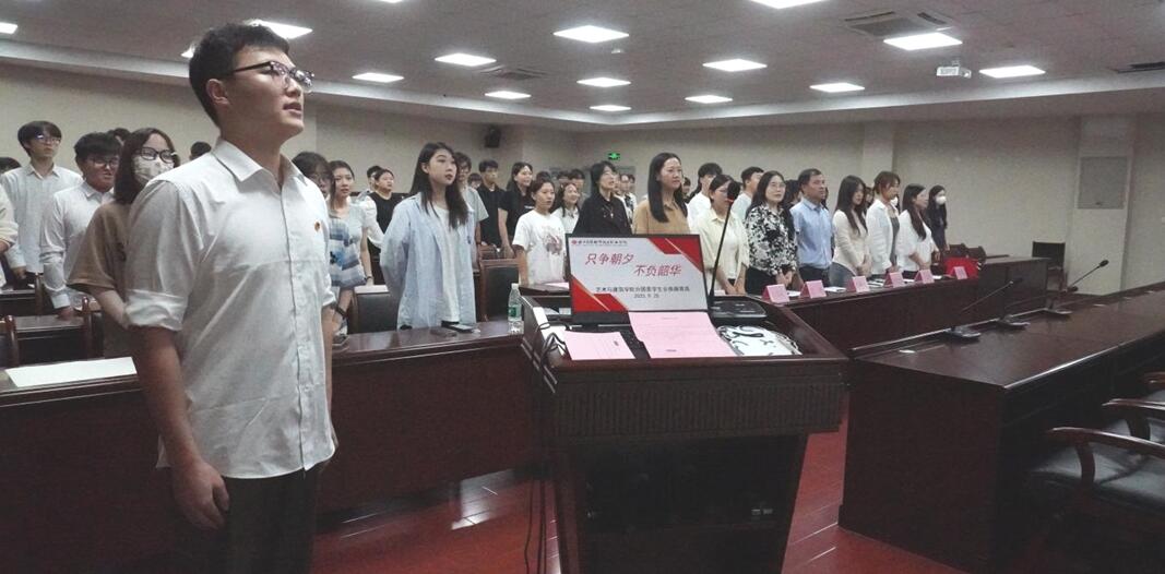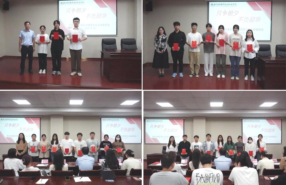 在庄严的《中华人民共和国国歌》的歌声中大会拉开序幕。会议第一项议程:颁发聘书。首先,分团委书记韩露老师对21级学生干部为艺术与建筑学院分团委学生会工作付出的努力给予肯定,“因为付出,所以成就;正是谦虚,才有向荣。”接着,由我院党总支副书记纪冰心老师,学生党支部书记、学工办主任李一帆老师及分团委书记韩露老师分别为上一届主席团、各部门负责人及团学干事颁发聘书。