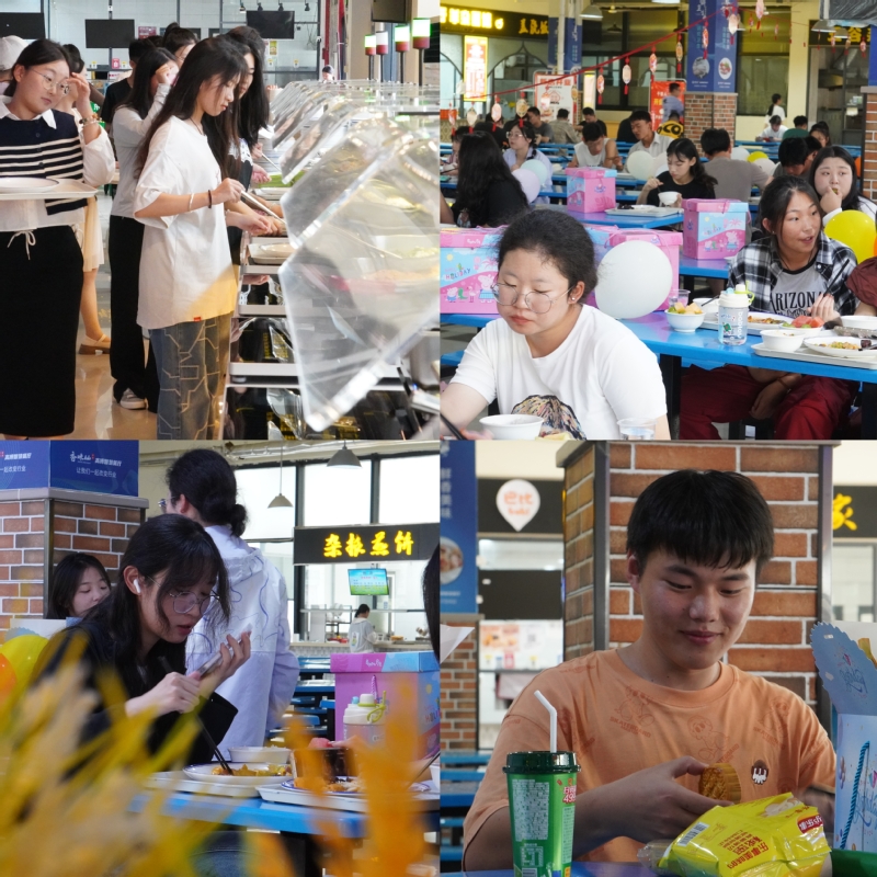 活动以自助餐形式进行,整个活动现场,节日气氛浓烈,充满欢声笑语,同学们从取餐、就餐到收餐盘都是井然有序,有同学现场与家人连线,幸福感满满。
