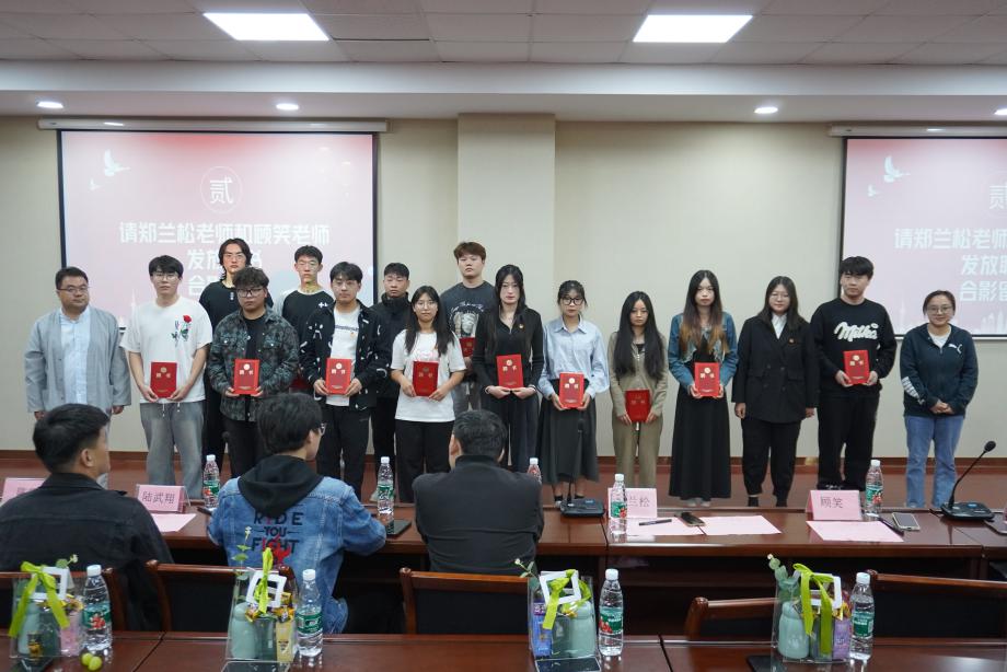 会议第二项议程,郑兰松老师和顾笑老师为第十五届学生干部颁发聘书并合影留念。