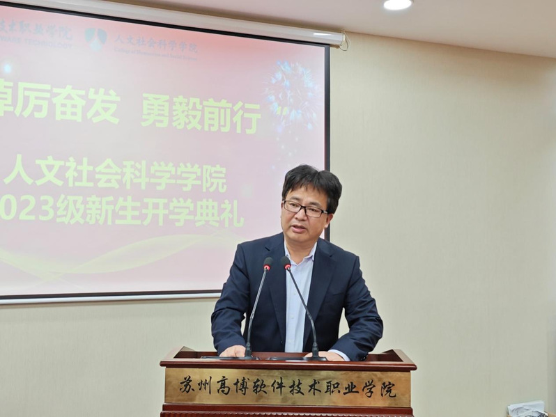 黄兴院长首先致辞,他代表全院师生向新加入人文学院大家庭的2023级全体新生表示热烈欢迎,并简要介绍了学院的学科设置、师资力量、人才培养方向等概况。黄院长表示近年来学院在认真抓好课堂教学的同时,积极拓展产教融合、校企合作渠道,深入实施课证融通,主动与国内国外高校对接,为学生开辟专接本、专升本升学通道,努力为学生搭建成长成才平台。最后,黄院长就如何尽快适应大学生活、如何让大学生活过得更有意义向新生们提出了三点希望。一是希望新生们明确目标,尽早做好大学三年规划;二是希望新生学会学习,努力掌握专业知识和专业技能;三是希望新生团结互助,努力建立良好的同学关系。黄院长勉励新生要志存高远,不负韶华,刻苦学习,努力成为不负时代所期、堪当时代大任的新时代青年。