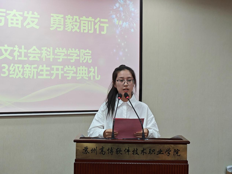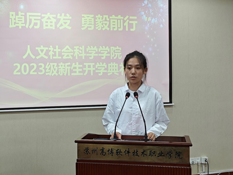 2023级新生代表田雨乐同学发言,她立志要和同学们携手共进,做自己人生的掌舵者,在今后的校园生活里,一定严守学校纪律,刻苦学习,乐观自信,严以律己。在学好专业知识的同时,多参加校园活动和社会实践,不断提升自身综合素质。