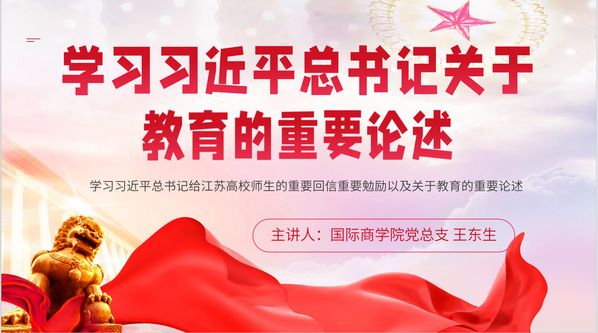 教育是国之大计、党之大计。国际商学院为了全面展现广大干部师生牢记习近平总书记嘱托,踔厉奋发新征程的生动实践和精神风貌,推进学习贯彻习近平新时代中国特色社会主义思想主题教育走深走实。于10月25日下午1点在行政楼325举办了主题为“学习习近平总书记给江苏高校师生的重要回信重要勉励以及关于教育的重要论述”的党课学习,本次党课学习由我院党总支委员王东生副院长主讲,全体教师党员参加学习。
