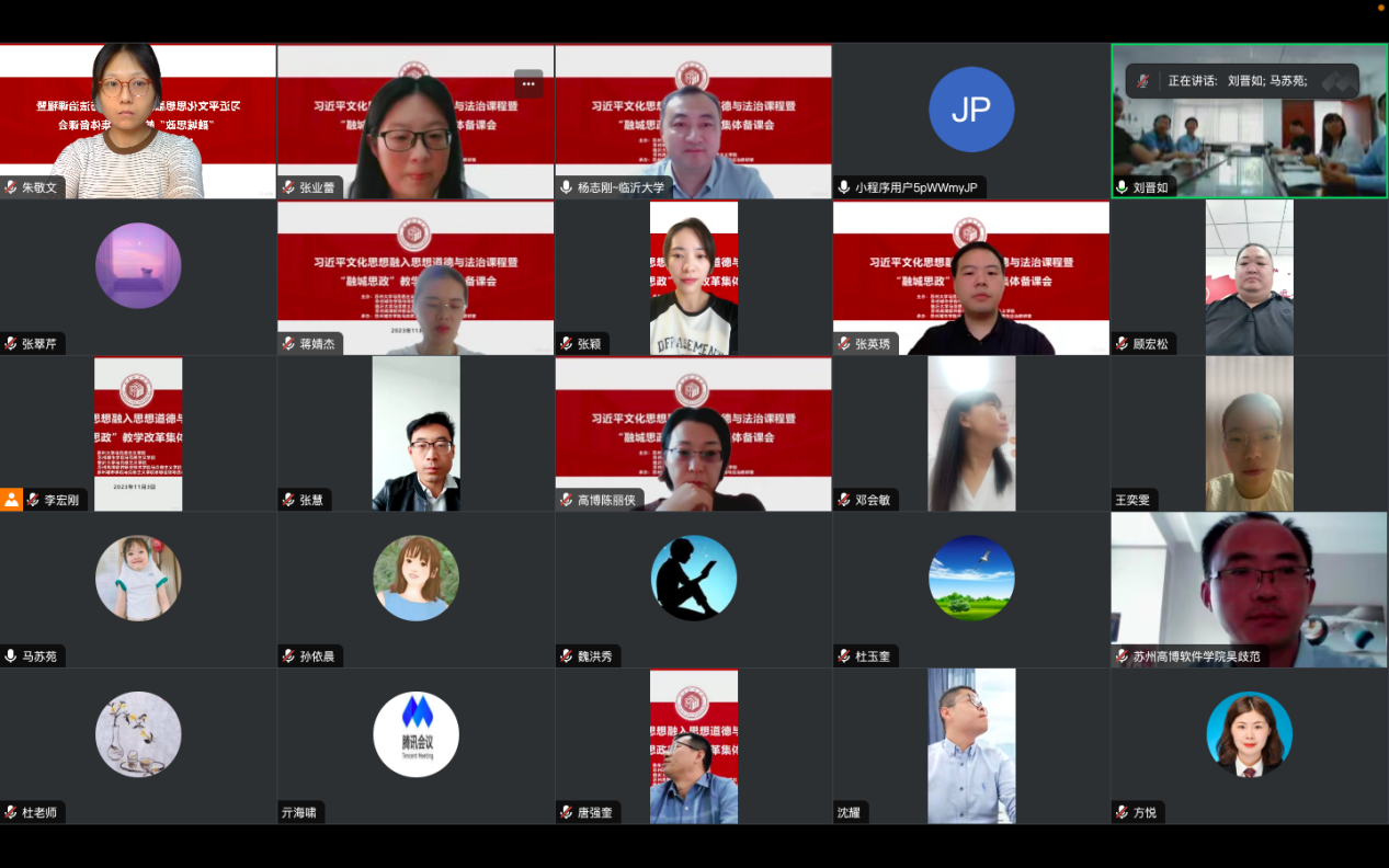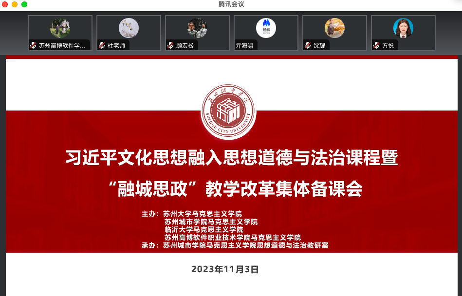 2023年11月3日上午,由苏州大学马克思主义学院、苏州城市学院马克思主义学院、临沂大学马克思主义学院、苏州高博软件技术职业学院马克思主义学院主办,苏州城市学院马克思主义学院思想道德与法治教研室承办的习近平文化思想融入思想道德与法治课程暨“融城思政”教学改革集体备课会于线上线下同步召开。会议由苏州城市学院德法教研室主任李宏刚主持。