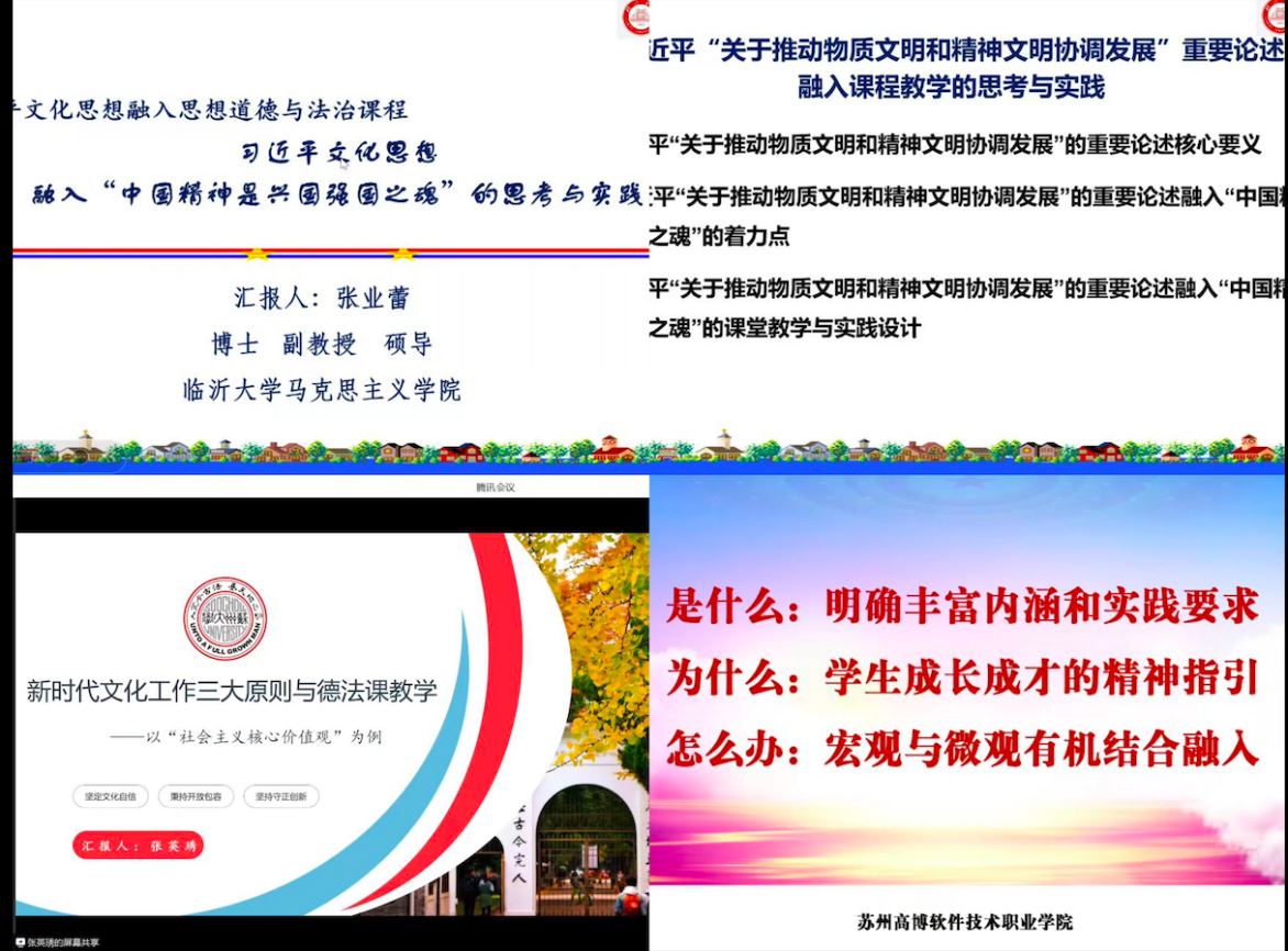 接着,苏州大学马克思主义学院教师张英琇,以新时代文化工作三大原则与德法课教学---以“社会主义核心价值观”为例,从坚定文化自信、秉持开放包容、坚持守正创新视角出发,探讨了如何讲清楚“社会主义民主”等知识点。苏州城市学院马克思主义学院教师刘晋如对《思想道德与法治》第五章内容进行教学展示,她从具体的现实案例切入,由浅至深,逻辑清晰,内容紧凑。临沂大学马克思主义学院张业蕾副教授,以习近平文化思想融入“中国精神是兴国强国之魂”的思考与实践为题展开分享,重点讲述了习近平“关于推动物质文明和精神文明协调发展”重要论述融入课堂教学的思考与实践。苏州高博软件技术职业学院马克思主义学院教师朱敬文以习近平文化思想融入思想道德与法治课教学的几点思考为主题,从是什么:明确丰富内涵和实践要求;为什么:学生成长成才的精神指引;怎么办:宏观与微观有机结合融入三个角度讲述了“两个结合”与思想道德与法治课融合的理论依据。